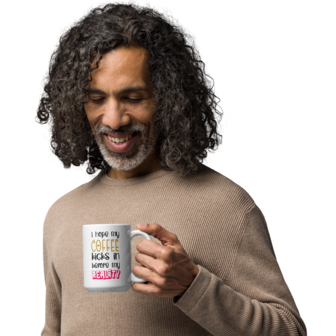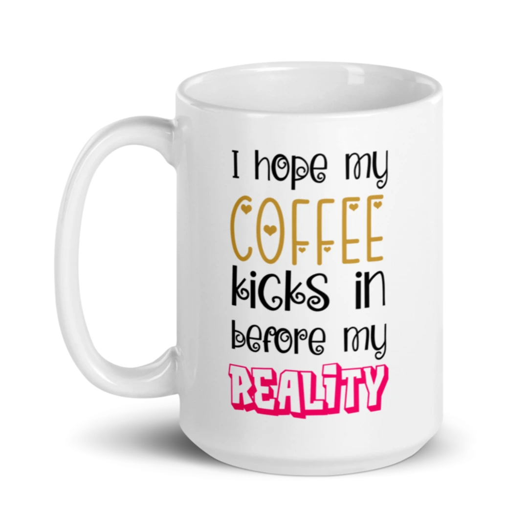 Looking for a mug with a personality? Look no further than Shop Wrenée™! Our 15 oz glossy white mug is both dishwasher and microwave-safe, making it the perfect addition to your daily routine. Plus, with a fun message like "I hope my coffee kicks in before my reality," you're sure to get a few laughs and brighten up any day. Grab one (or a few!) for yourself and your coffee-loving pals.