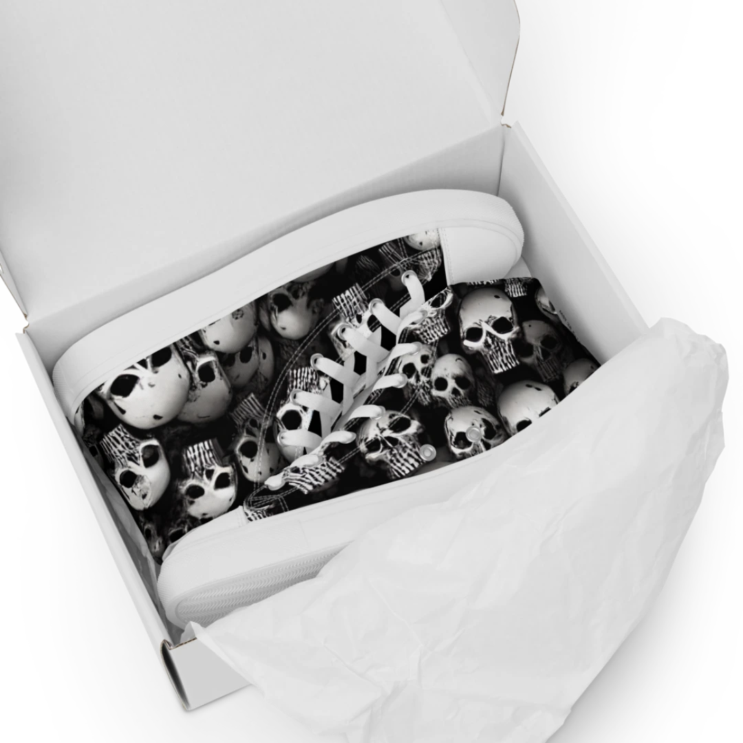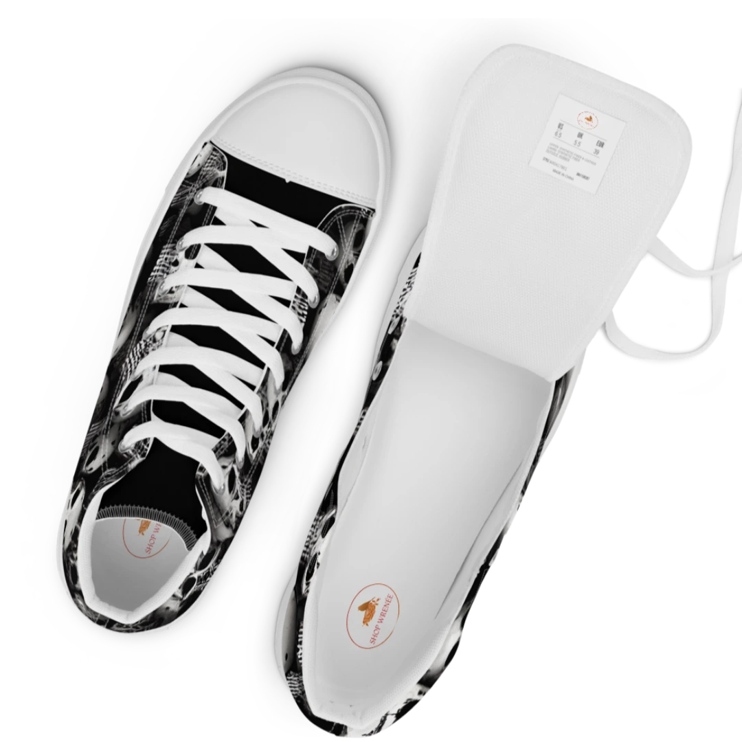 Step up your shoe game with Shop Wrenée's Doom Fest High Top Canvas Shoes. Made with a 100% polyester canvas upper side, these shoes are durable enough to withstand daily wear and tear. The ethylene-vinyl acetate (EVA) rubber outsole provides excellent grip and traction, making these shoes perfect for any occasion. The breathable lining and soft insole keep your feet comfortable all day long, while the faux leather toe cap adds a touch of style. The white laces and padded collar complete the look, making these shoes a must-have for any fashion-forward individual.