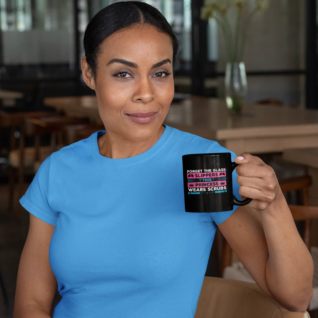 Tired of the same old princess cliches? We have the perfect solution for you! Introducing our "Forget the Glass Slippers This Princess Wears Scrubs" mug, guaranteed to make a statement wherever you go. The sleek black design and 11oz size make it the perfect addition to your coffee or tea routine. Plus, it's a great gift for any healthcare worker in your life. Get yours today and show everyone that you're a princess who works hard and saves lives! Microwave and dishwasher safe.