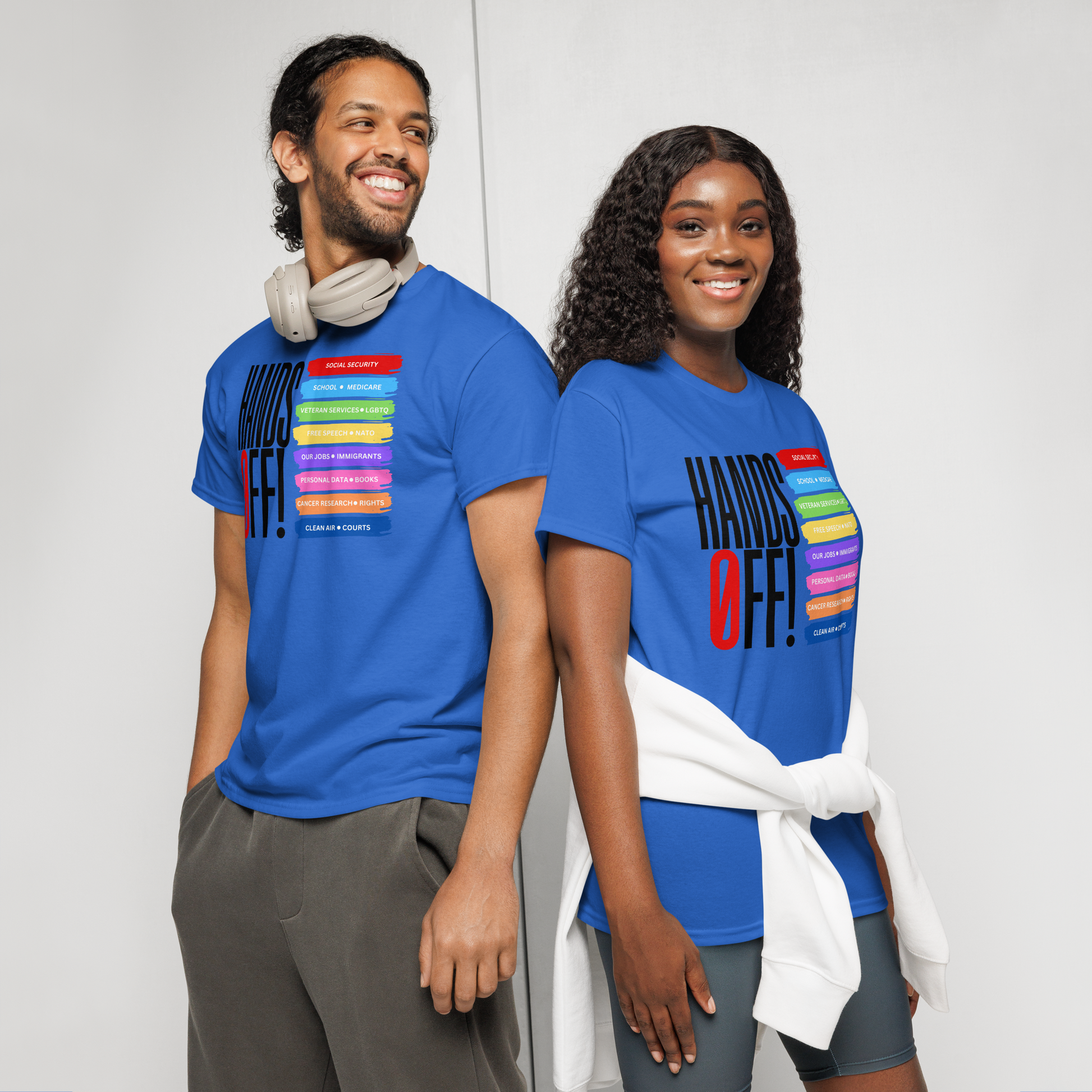 Show your support for the Hands Off List movement with our protest t-shirt! Crafted from a soft blend of 50% cotton and 50% polyester, this t-shirt is both comfortable and stylish. The DryBlend® moisture-management fabric ensures you stay dry and fresh throughout the day. The modern classic fit and rib collar in classic width give this t-shirt a timeless look. Plus, the taped neck and shoulders add extra comfort and durability. Say goodbye to annoying labels with the tear-away label feature, perfect for those with sensitive skin. Make a statement with our Hands Off List protest t-shirt.