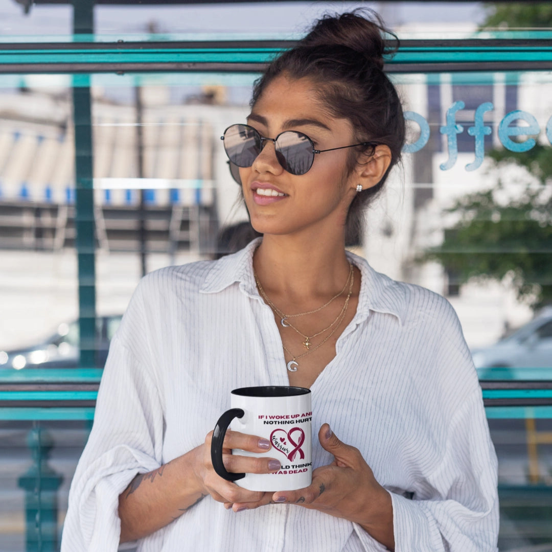 Looking for a mug that combines style with durability? Look no further than the Shop Wrenée™ If Didn't Hurt Ceramic Mug! Designed with a sleek black rim, inside, and handle, this 11 oz mug is not only aesthetically pleasing, but also practical. Crafted from high-quality ceramic, it's both dishwasher and microwave safe, allowing for hassle-free usage. Whether you're starting your day with a hot cup of coffee or winding down with some herbal tea, sip it like a true myeloma warrior and show your support. Get yourself this empowering mug and feel stronger with every sip!