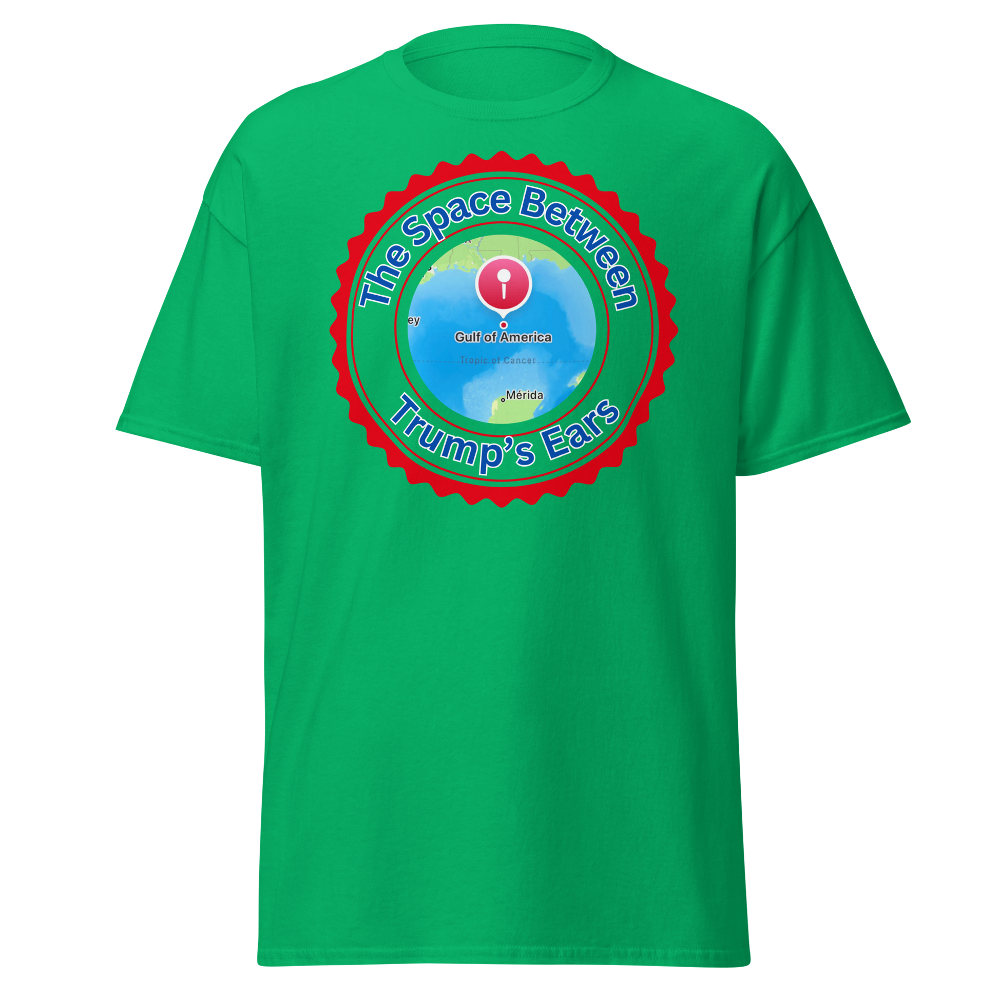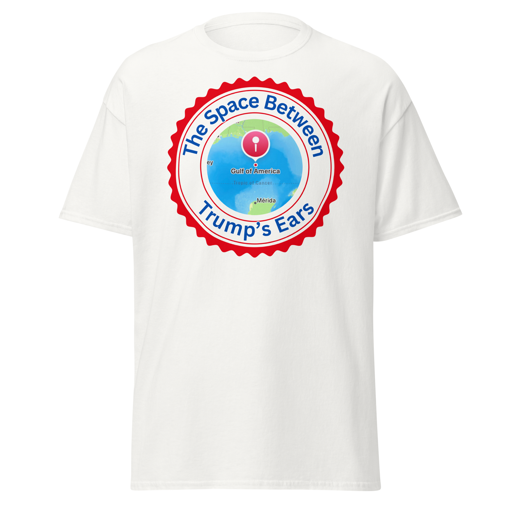 Unleash your quirky side with our "The Gulf of America-The Space Between Trump's Ears" T-shirt. Made from 100% cotton, this tee is as comfortable as it is cheeky. Featuring tubular fabric, taped neck and shoulders, and a double seam at sleeves and bottom hem, this shirt is perfect for those who appreciate a good laugh and quality craftsmanship.