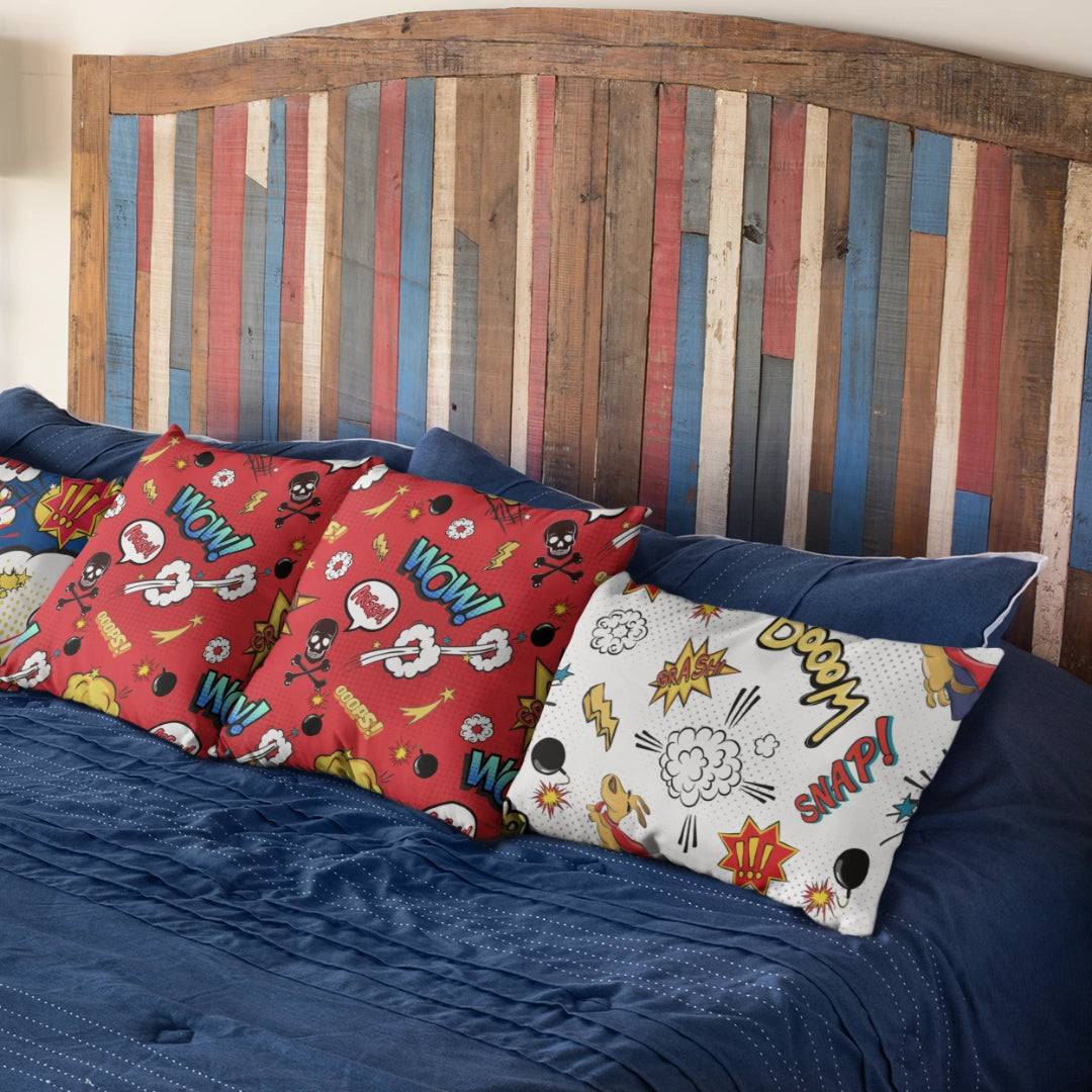 Your child's imagination will soar with the Super Hero White Crash Boom Snap pillow from Shop Wrenée™. Created with the finest 100% polyester material, this pillow is not only snuggly and cozy but also machine washable for your convenience. Mix and match with other items from our super hero collection for a complete look. Perfect for any little crime fighter in training!